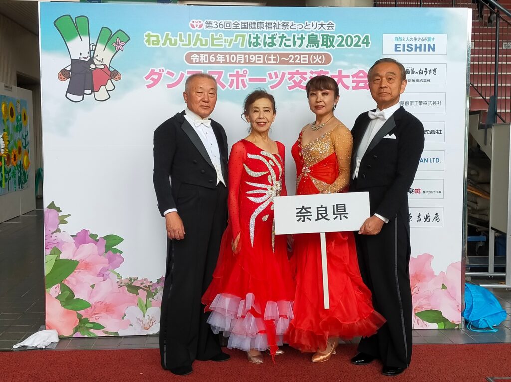 2024年10月20日に鳥取県で開催されました「ねんりんピックはばたけ鳥取2024」のダンススポーツ部門に、奈良県代表選手として、花岡正廣・上田佳子組と伊東勝・大江清美組が参加され、精一杯頑張って踊られました。 選手の皆様、お疲れさまでした。